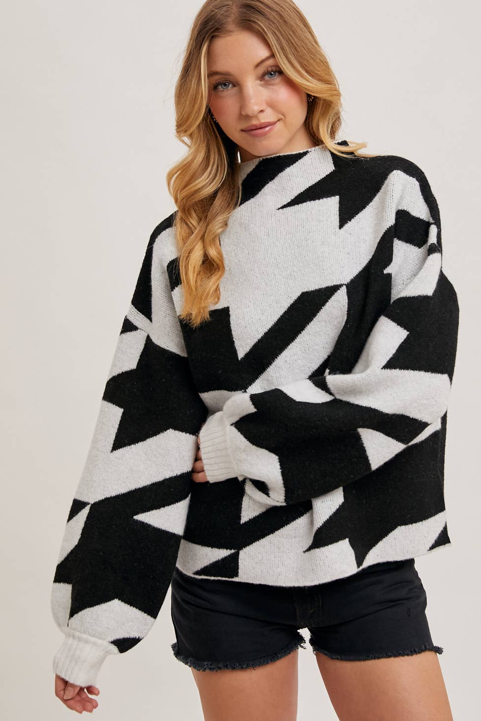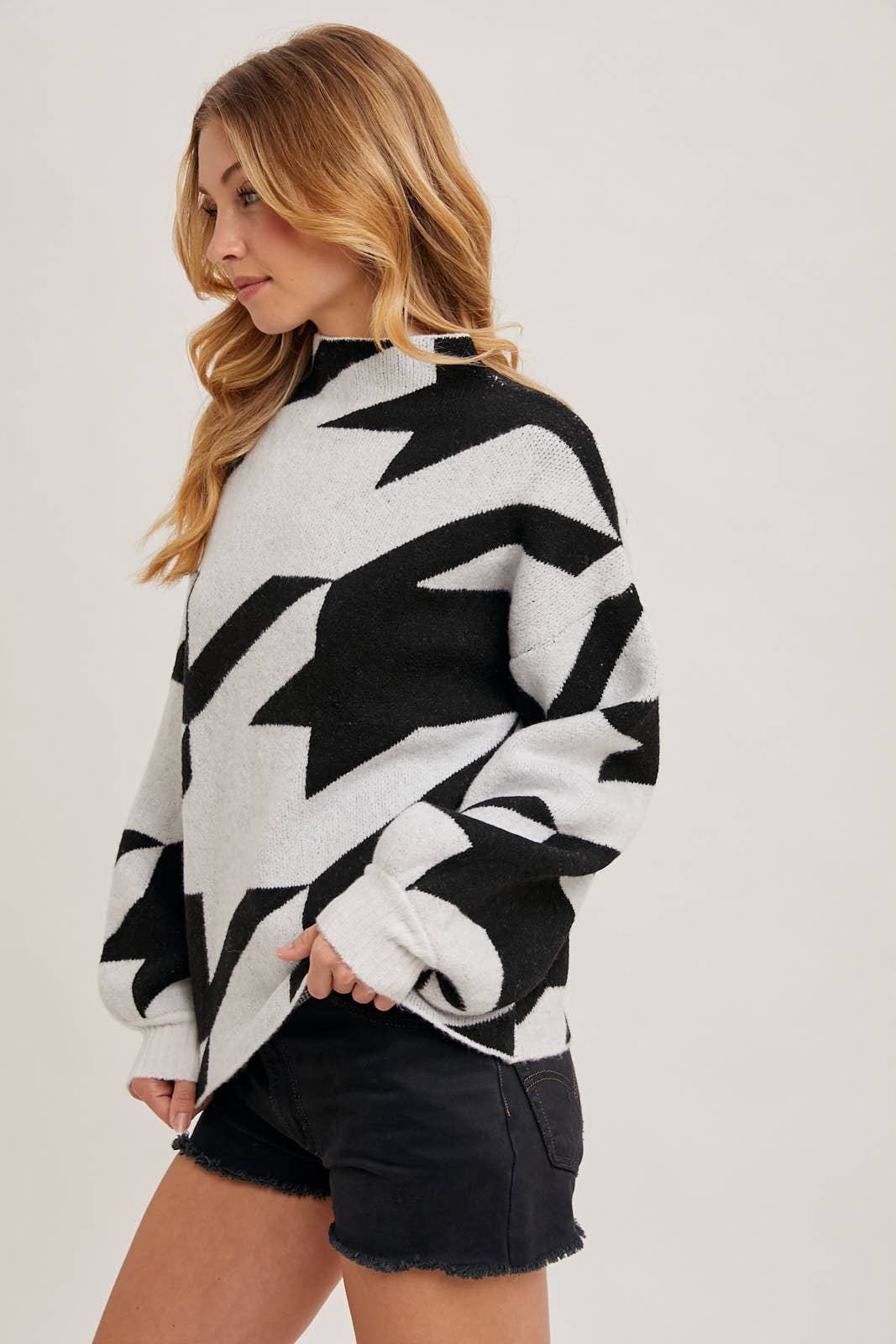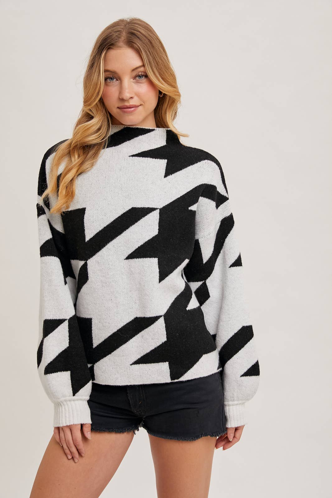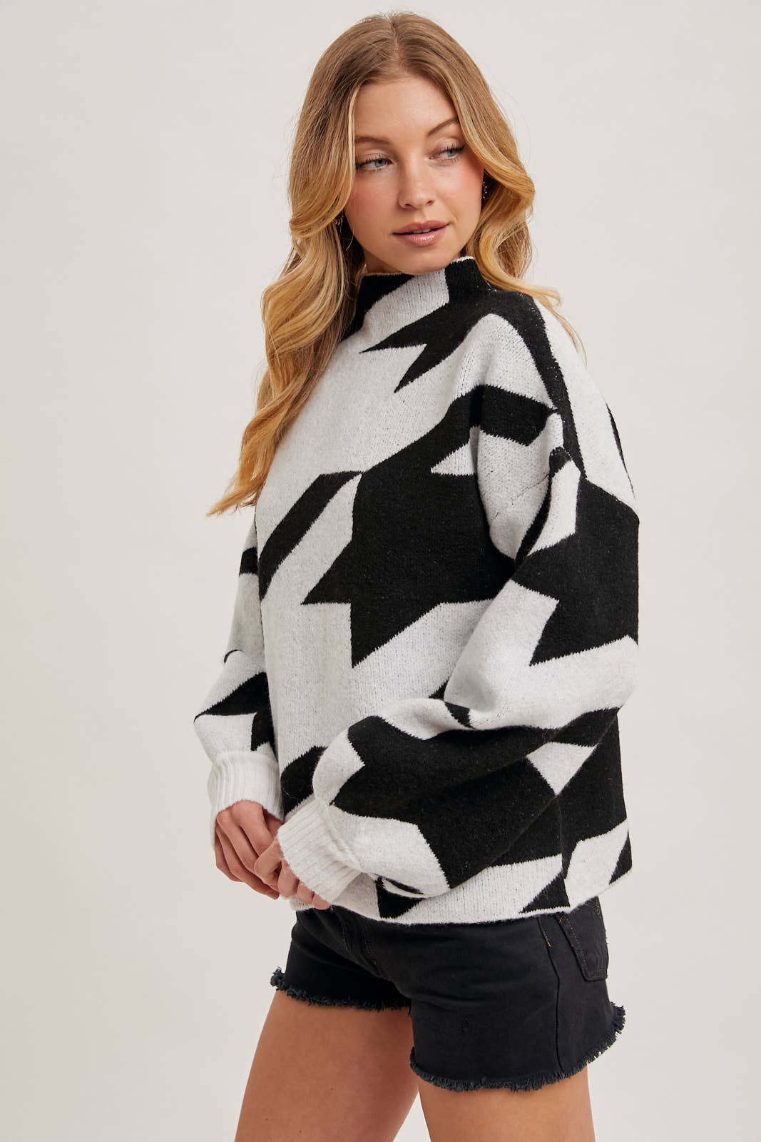 HOUNDSTOOTH MOCK NECK LOOSE FIT KNIT SWEATER IN BLACK AND WHITE
